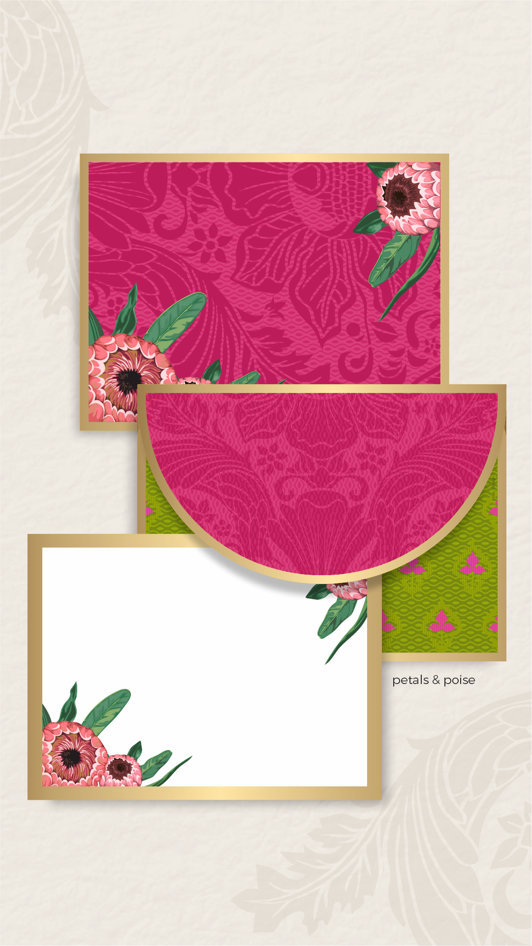 Modern yet rooted in Indian heritage — bold blooms and verdant tones make this a striking choice. Use it for festive invites, chic correspondence, or standout gifting.