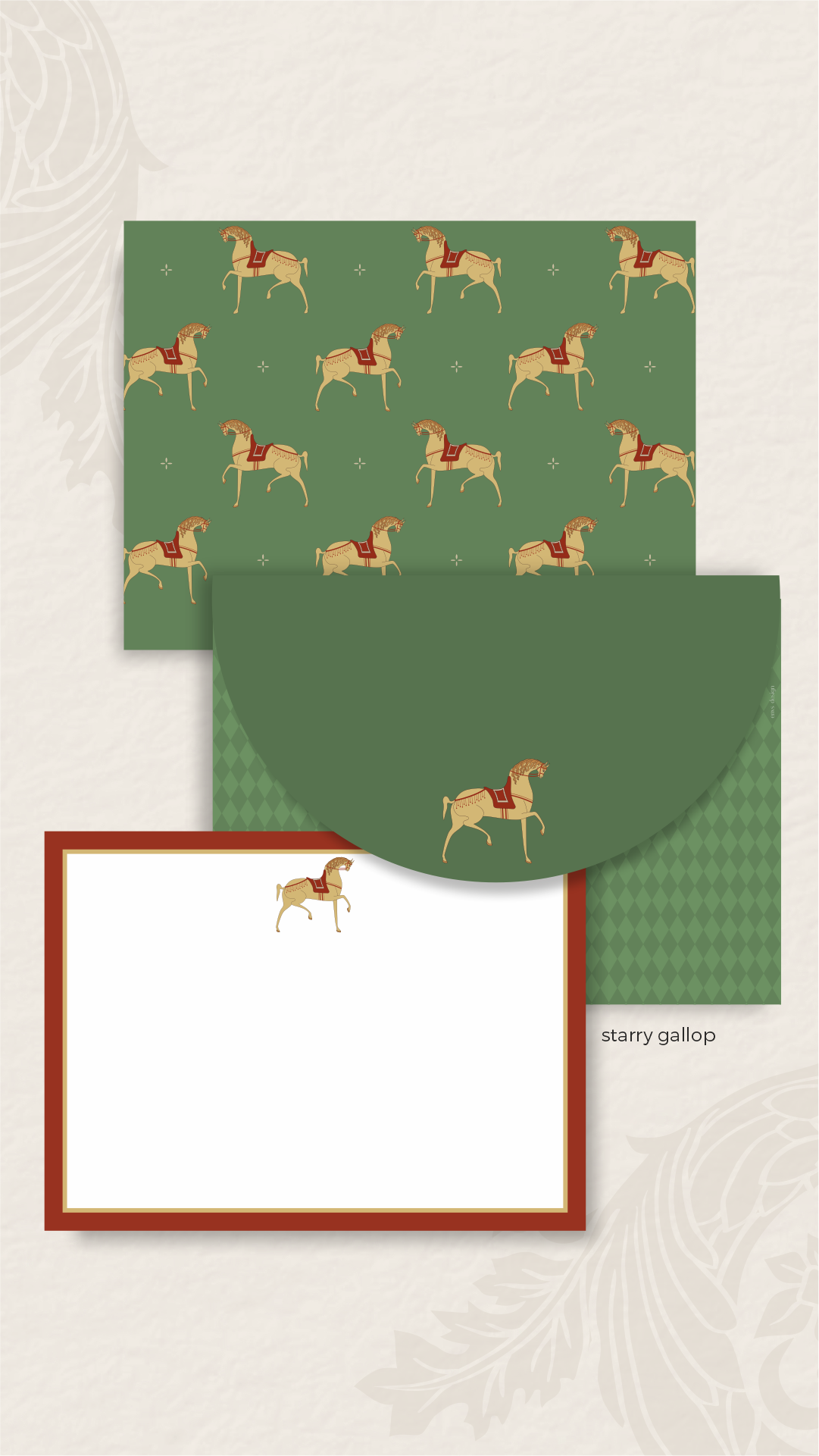 Prancing horses on a heritage green canvas with terracotta accents — a royal yet playful set for festive notes, heritage gifting, or artistic correspondence.