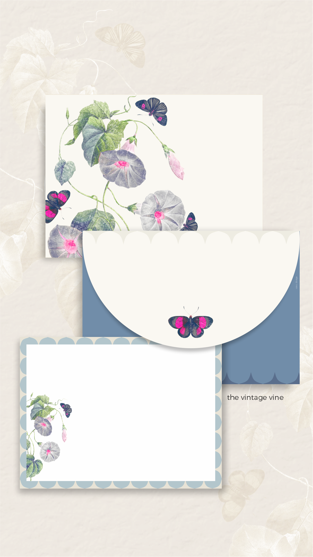 A nostalgic blend of vines and butterflies in blue and lilac tones — crafted for love letters, baby showers, or poetic gifting.