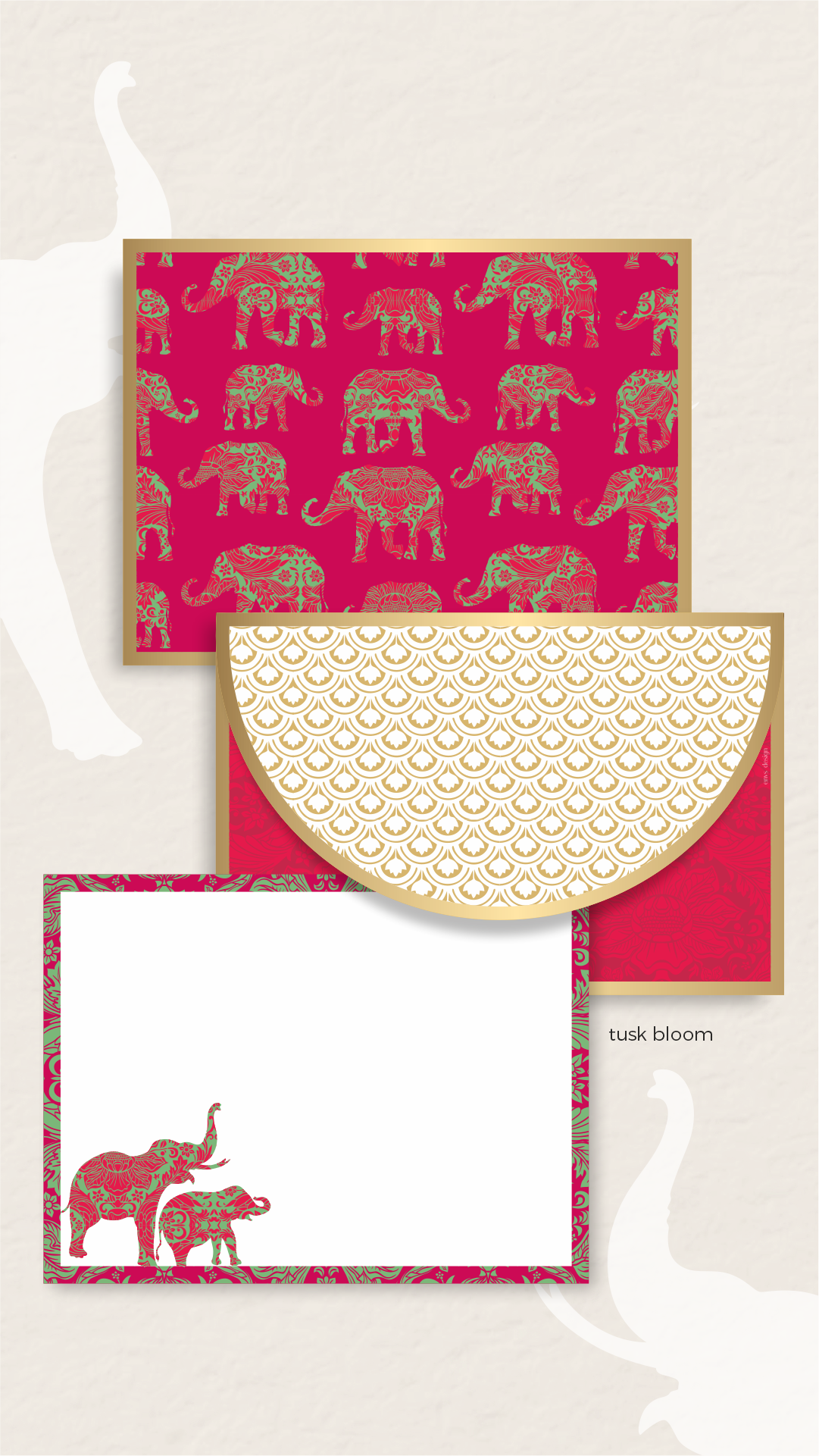 Rich magenta meets gold-detailed elephants in this vibrant design. Ideal for traditional celebrations, wedding invites, or memorable messages that deserve a bold impression.